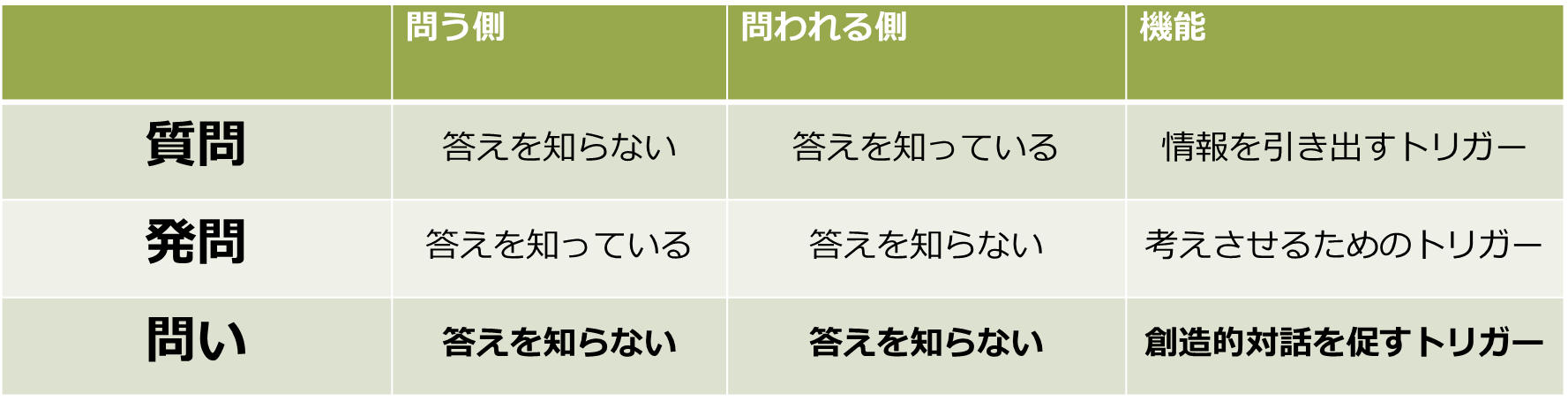 この書籍でこの質問・発問・問いの違いを整理された時に僕が感じたのは、僕も含めて多くの日本人は、これまでの学校教育や、これまでの組織の中でのコミュニケーションの中で、「問い」に対する誤った認識を社会的に認知で刷り込まれてきたのだろうと強く感じました。