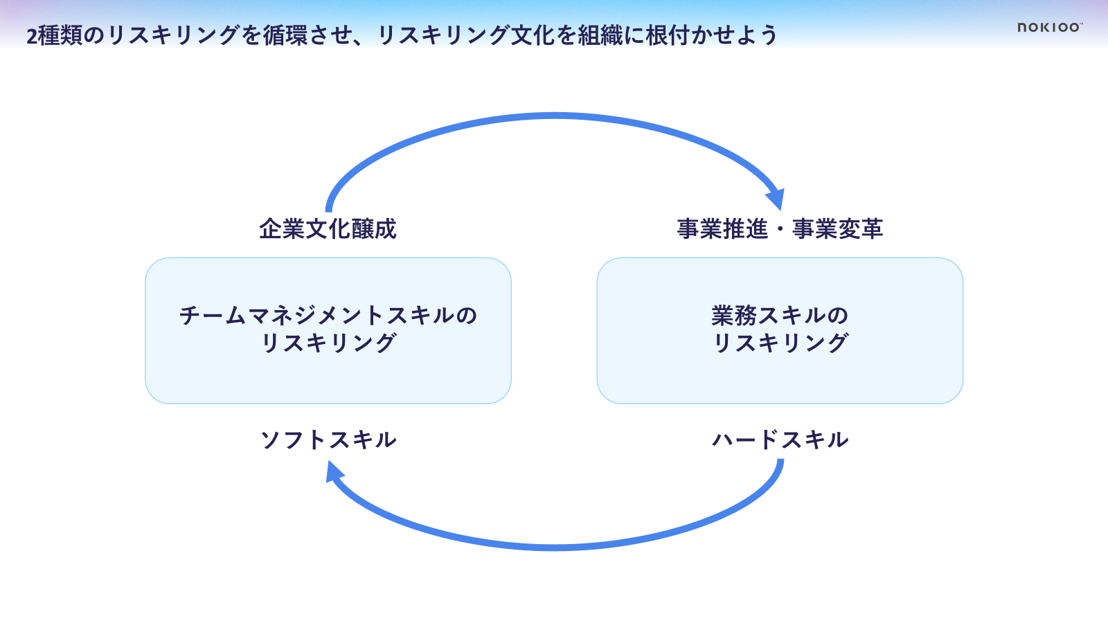 そしてこの2つのリスキリングは別々ではなく、図にあるように循環しながら組織を前に進めていきます。