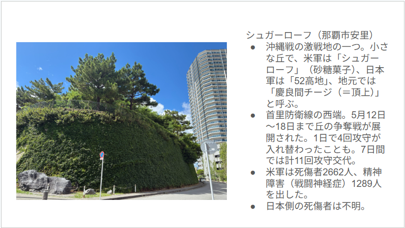 そして、ホテルの目の前にあったその小高い丘が、「シュガーローフ」と呼ばれる沖縄戦の激戦地の一つであり、首里防衛線の西端として、日米両軍による激しい戦闘が行われ、多くの戦死者を出した場所だったと知りました。