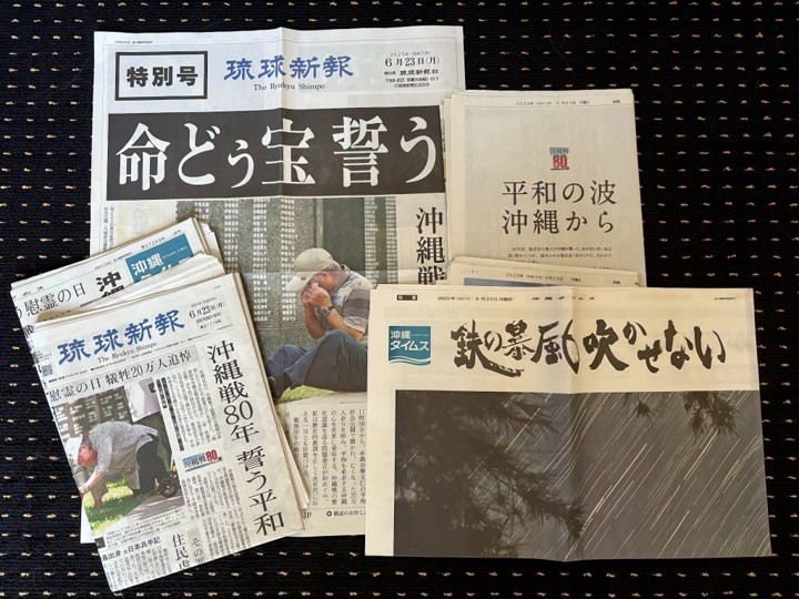 6月27日にお二人にガイドいただき戦争遺構巡りをしましたが、その数日前の6月23日はまさに80年前に実質の沖縄戦が終結し日であり、沖縄到着直後に、佐藤さんから地元新聞を一式いただき、それらに目を通して、沖縄の人たちの想いをインプットしながらの遺構巡りのスタートでした。