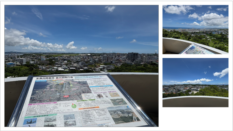 嘉数高台公園から、普天間基地を北に見ながら、海岸線沿いに1945年4月1日の米軍上陸からの展開と嘉数の激戦に関する話や、普天間をめぐる歴史、地域の問題・感情をお聴きしたり、その話を聴いている最中に真上をオスプレイが航行するのを体験したり、