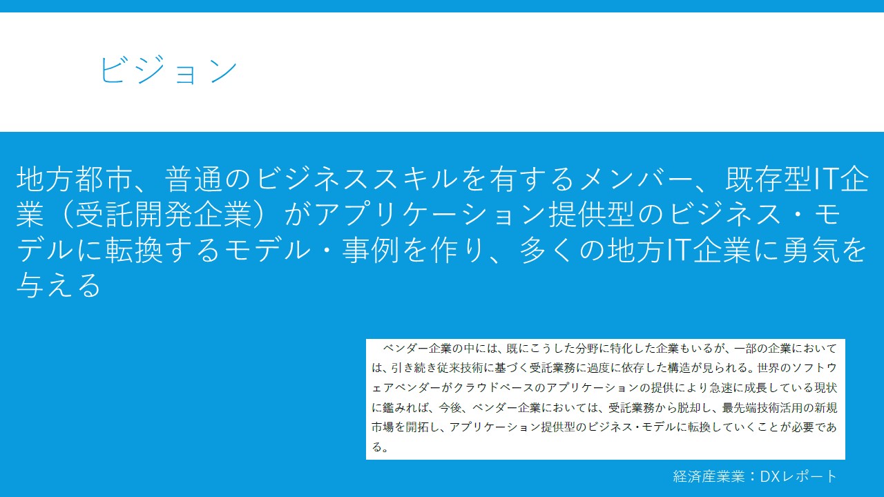 ちなみに経産省のDXレポートの「3.4.2 ベンダー企業の目指すべき姿」というパラグラフに「ベンダー企業の中には、既にこうした分野に特化した企業もいるが、一部の企業においては、引き続き従来技術に基づく受託業務に過度に依存した構造が見られる。世界のソフトウェアベンダーがクラウドベースのアプリケーションの提供により急速に成長している現状に鑑みれば、今後、ベンダー企業においては、受託業務から脱却し、最先端技術活用の新規市場を開拓し、アプリケーション提供型のビジネス・モデルに転換していくことが必要である。」という記載がある。